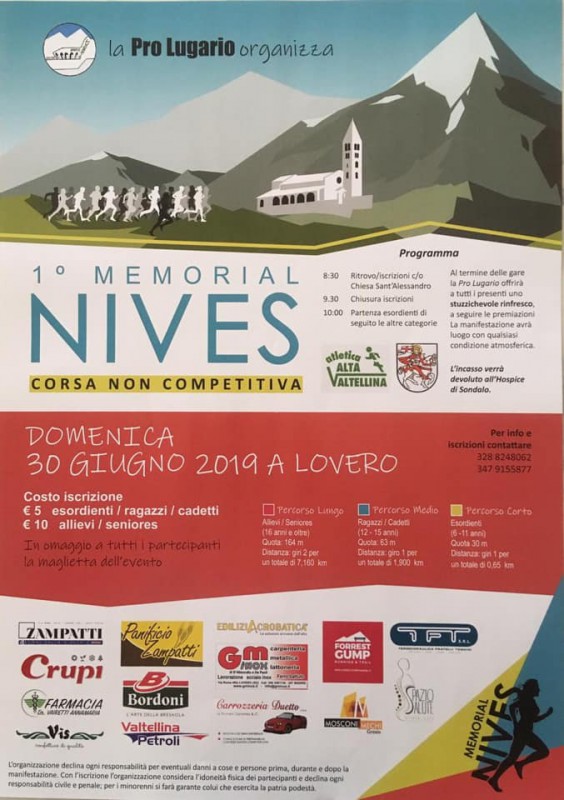 Domenica 30 Giugno 2019 la Pro Lugario a Lovero organizza il 1° Memorial Nives corsa non competitiva, evento in ricordo di una giovane madre del paese scomparsa lo scorso anno, molto appassionata di questo sport.
